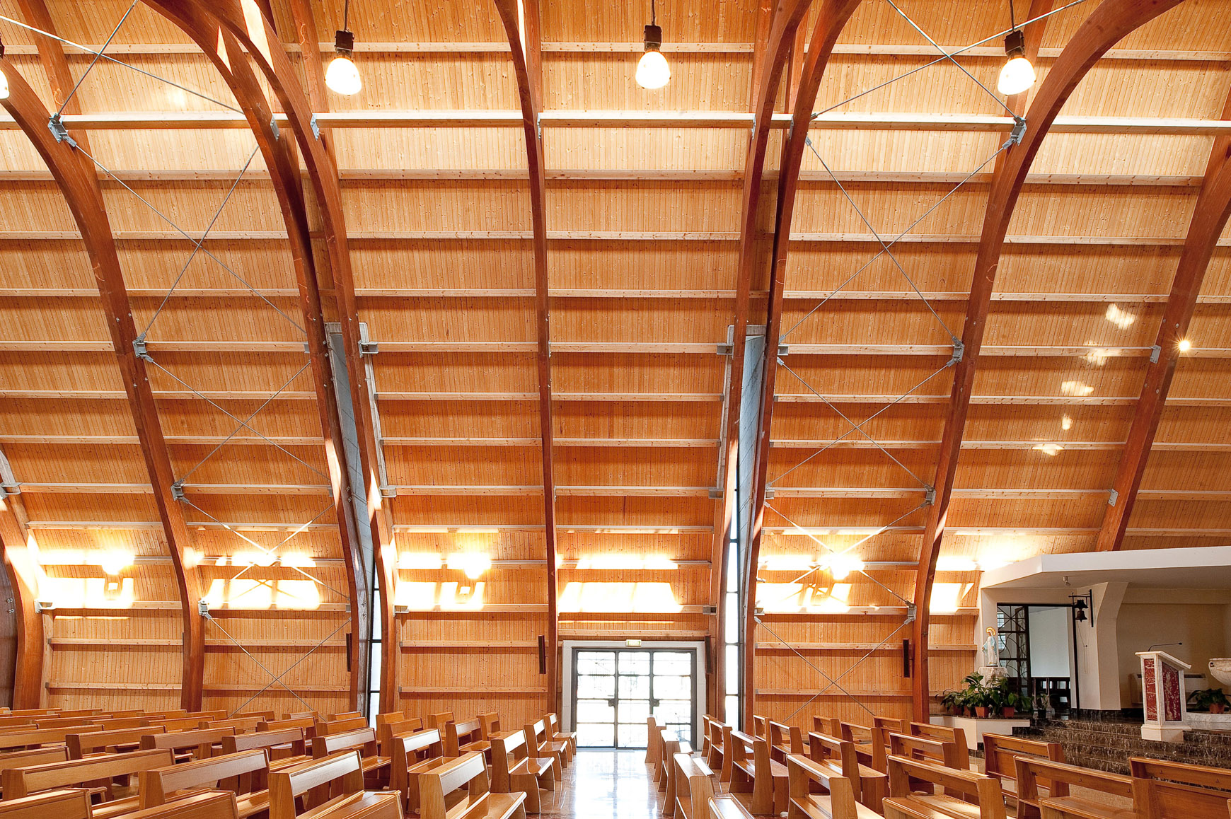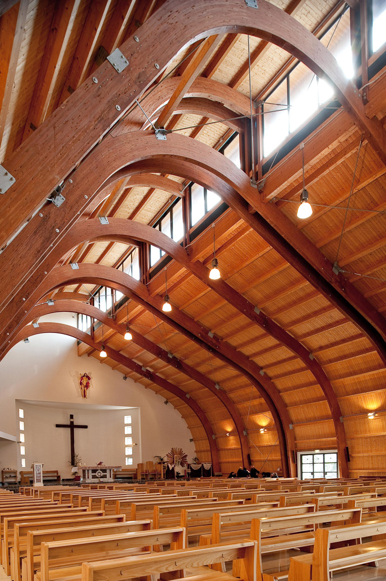 La Chiesa è situata nel quartiere di Arzano, si erge come punto di riferimento spirituale e di accoglienza. La sua imponente struttura si slancia verso il cielo, con travi lamellari curve che creano un intreccio armonioso di leggerezza e dinamismo. Il legno, protagonista dell'architettura, non solo aggiunge calore e bellezza, ma migliora anche il comfort acustico e termico, favorendo un’atmosfera di raccoglimento. La luce naturale penetra attraverso aperture studiate, esaltando il materiale naturale e creando un dialogo profondo con l'ambiente.