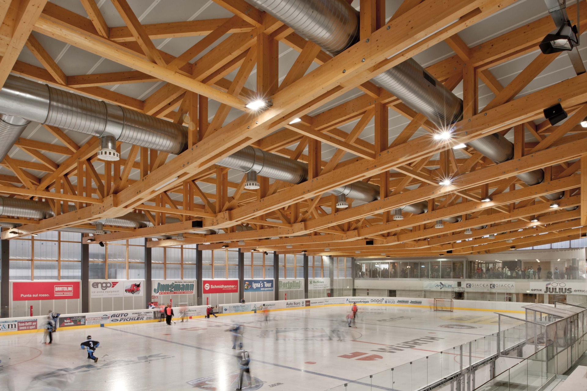 Tantissimi stadi del ghiaccio in tutto il mondo hanno la copertura di legno, le ragioni sono molteplici. Il contesto ambientale, di solito nordico e montano, le gradi luci libere per le dimensioni della pista, le temperature interne sotto lo zero. Le basse temperature sulla pista e quelle più alte nelle tribune spettatori, possono portare alla formazione di condensa dell’umidità nell’aria, in particolare nel periodo estivo. Questo fenomeno, oltre a disturbare l’attività sportiva, nel tempo può logorare le strutture interne. La struttura di legno e un buon sistema di copertura sono la soluzione ideale.