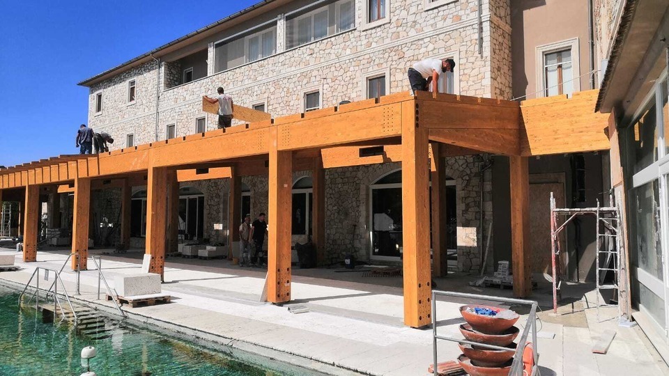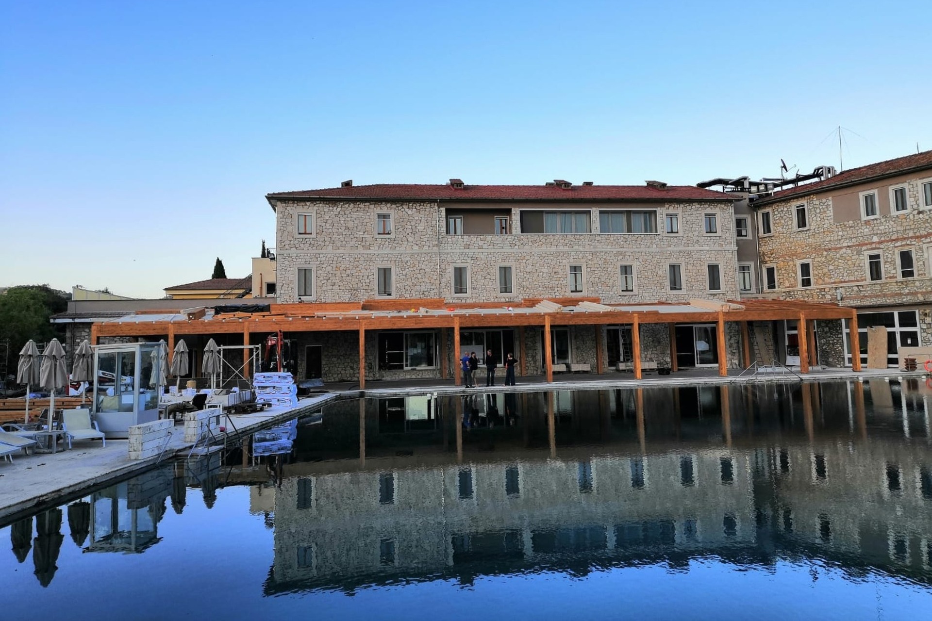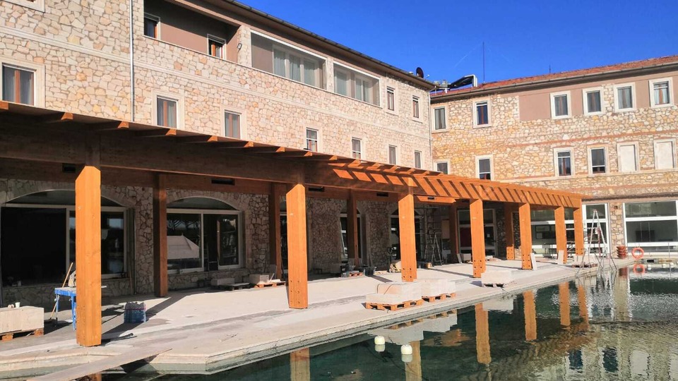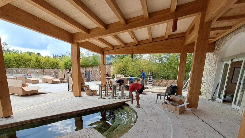 Due settimane per demolire e ricostruire dalle fondamenta lo storico Ristorante 1919, completo di nuovi impianti e della nuova pavimentazione in travertino. Il nostro intervento ha riguardato la progettazione strutturale e la realizzazione del grande porticato in legno completo di sistema di copertura, che si affaccia sulla grande vasca naturale dove sgorga la millenaria sorgente termale. La collaborazione con l’Arch. Lattanzi e Statella Architetti e l’ing. Gustavo Gennari è stata risolutiva.